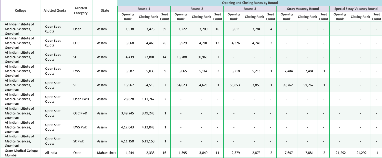 Standardized college, quota and category names. No more variation in names across rounds. State column added for state wise trends in AIQ counselling.