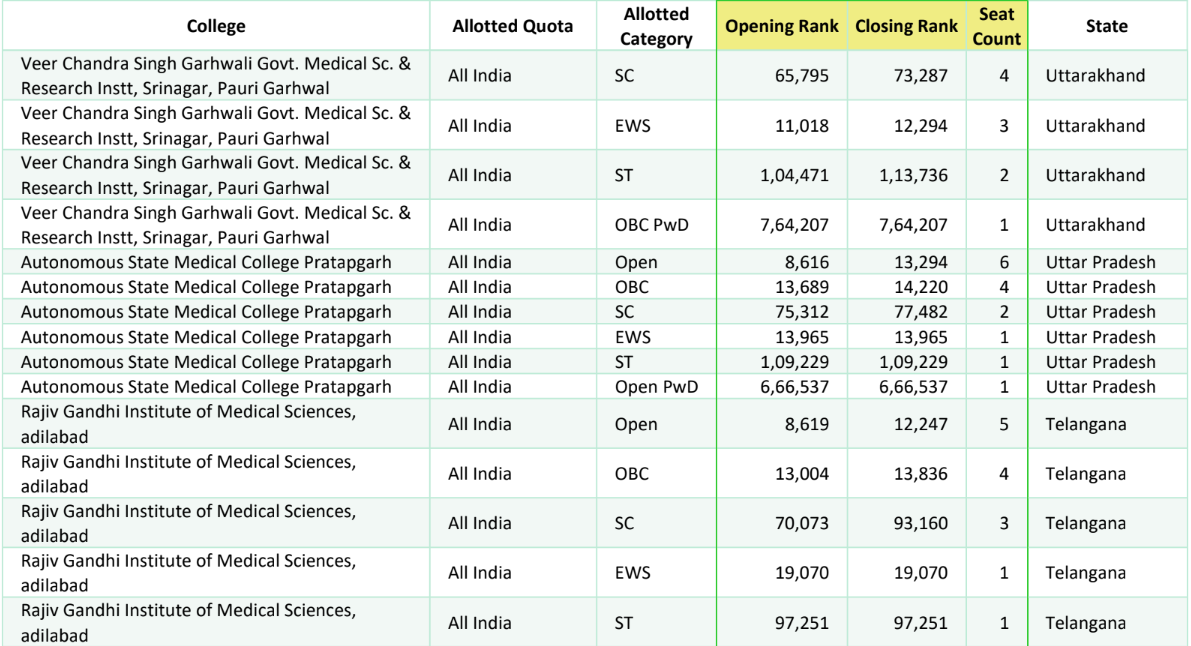Opening and closing ranks added for each round across college, quota and category combination